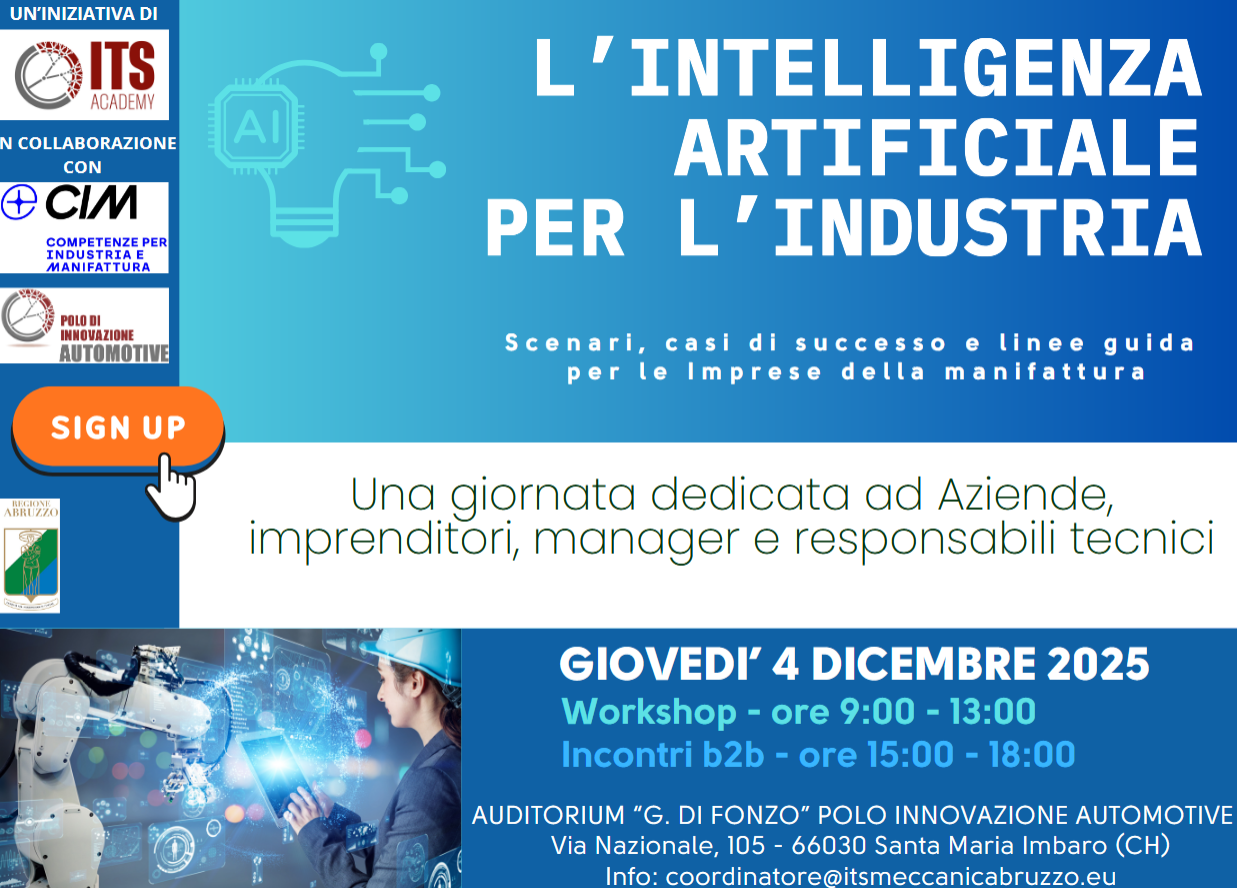 L’ITS Academy Sistema Meccanica di Lanciano, in collaborazione con CIM e Polo Automotive organizza il workshop “L’Intelligenza Artificiale per l’industria”, che si svolgerà giovedì 4 dicembre 2025 dalle 9 alle 13 presso la sede del Polo a Santa Maria Imbaro (Ch). Nella stessa giornata, nel pomeriggio, sono previsti anche incontri b2b per approfondire ulteriormente questa […]
